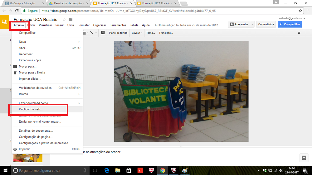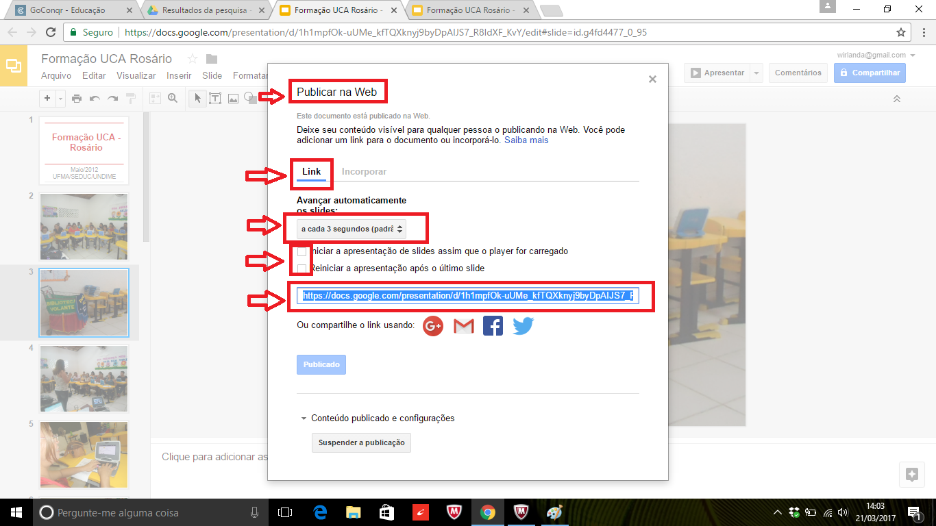 1-Crie seu slide/apresentação no Google Apresentação e salve-o (imagem 1);2-Vá até o menu ARQUIVO >PUBLICAR NA WEB (imagem 2);3-Configure algumas informações da caixa de texto (LINK) que abrirá: avançar automaticamente os slides e iniciar/reiniciar a apresentação - clique nas caixinhas para confirmar :INICIAR A APRESENTAÇÃO DE SLIDES ASSIM QUE O PLAYER FOR CARREGADO/REINICIAR A APRESENTAÇÃO APÓS O ÚLTIMO SLIDE ( imagem 3);4-Copie o link disponibilizado para compartilhar com os colegas (imagem 3) e clique em no botão PUBLICAR.5-Veja como ficará sua apresentação na Web: https://docs.google.com/presentation/d/1h1mpfOk-uUMe_kfTQXknyj9byDpAIJS7_R8IdXF_KvY/pub?start=true&l...(MODELO EXEMPLO).