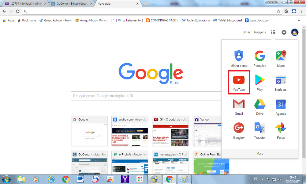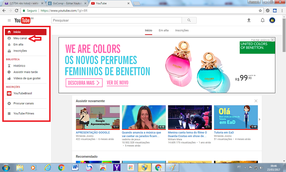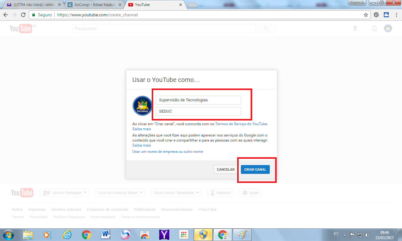 Professor, você já pensou em criar um canal Youtube e não sabe como fazer?Siga os passos abaixo e aprenda a criar seu próprio canal. As imagens o ajudarão a entender as orientações:1-Faça login no Google;2-Acesse o ícone do YOUTUBE nos Apps;3-Clique no menu a esquerda MEU CANAL;4-Sendo a primeira vez, aparecerá uma janela com informações para serem confirmadas. Clique no botão CRIAR CANAL;5-No canto superior direito, clique na setinha para fazer upload de seu vídeo;6-Selecione o arquivo para enviar que está no seu computador (pode ser vídeo ou fotos);7-Quando o arquivo/vídeo carregar, clique no botão PUBLICAR;8-Observe que algumas informações estarão disponíveis para edição;9-Quando o processamento do vídeo for concluído clique no botão CONCLUÍDO;10-Seu canal , agora, já tem o primeiro vídeo disponível para ser visto pelo público. Caso queira editá-lo continue com os passos a seguir:11-Cliqeu no botão GERENCIADOR DE VÍDEOS para editá-lo;12-Na sequência, clique em EDITAR;13-Na próxima página você encontrará várias opções de edição: inserir áudio, legendas e fazer melhorias no vídeo.14-Experimente as opções e no final não esqueça de SALVAR SUAS ALTERAÇÕES.