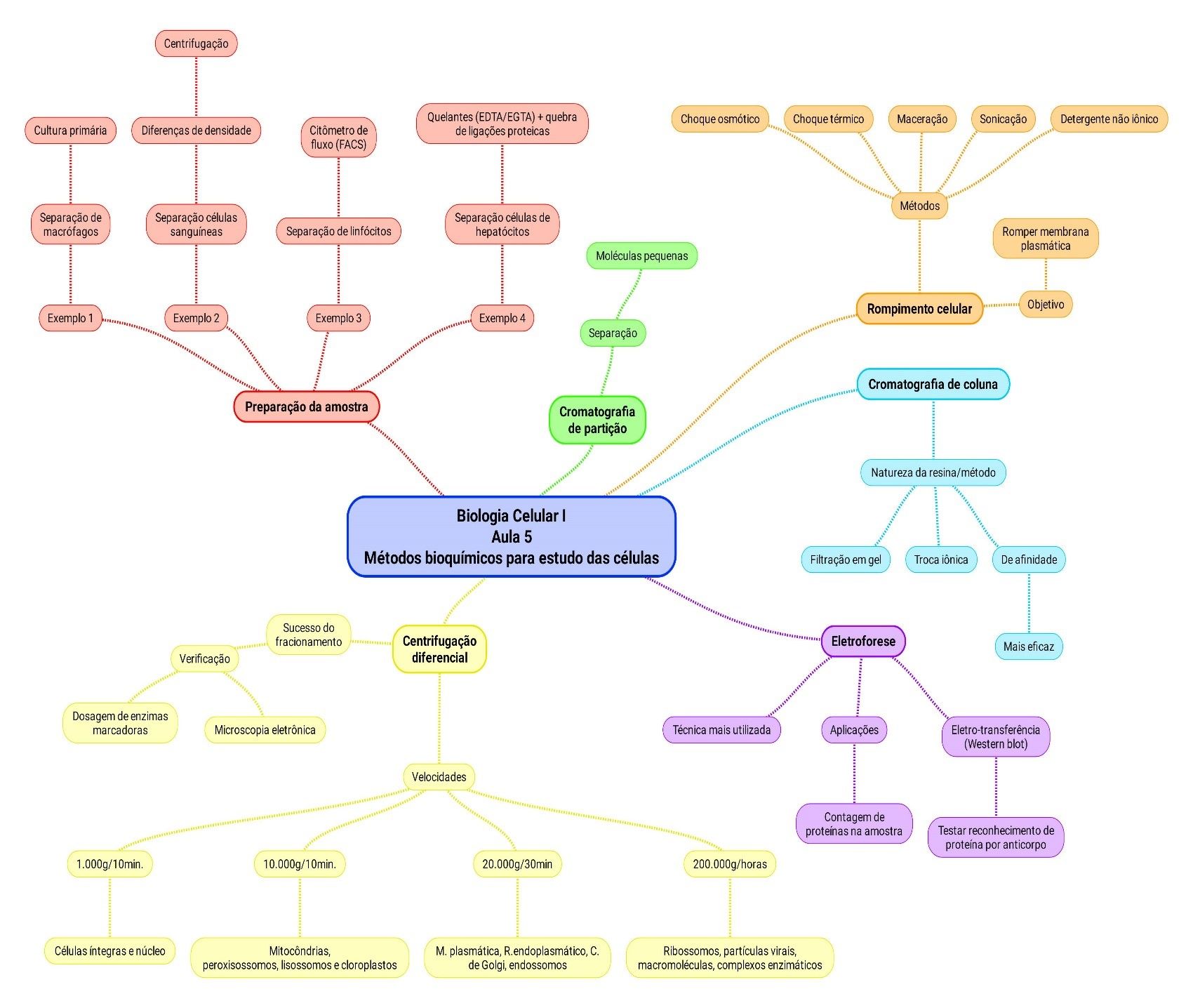 LICENCIATURA EM CIÊNCIAS BIOLÓGICAS – CEDERJ - UENF SEGUNDO PERÍODO DISCIPLINA: Biologia Celular 1 Resumo: Aula 5 - Métodos bioquímicos para o estudo da célula Preparando a amostra · Para obter preparações de organelas isoladas e purificadas, é preciso romper as células. · São realizados diferentes procedimentos para adquirir uma amostra homogenia de acordo com tipo de célula que se quer estudar. · Exemplo 1: Amostra de exsudato peritoneal - A separação dos macrófagos de outras células que foram obtidas com a extração da amostra do exsudato peritoneal é realizada através de cultura primária explorando a atividade biológica natural dos macrófagos devido a sua adesão a substratos como vidro e plástico. · Exemplo 2: Separação de células do sangue - As hemácias e os leucócitos circulantes podem ser separados por diferença de densidade. Para agilizar o processo a amostra contido em um tubo de vidro é centrifugada. Assim, devida a densidade, as hemácias ficarão no fundo, sobre ela uma fina camada esbranquiçada contendo os leucócitos, e no sobredante o plasma sem células. · Precipitado é o material que se depositou no fundo do tubo que foi centrifugado e sobredante (pellet) é o material que não se depositou. · Exemplo 3: Separação de diferentes classes de linfócitos - A separação das diferentes classes de linfócitos é possível devido as diferenças das moléculas de sua membrana plasmática exposta ao meio extracelular que são incubadas com anticorpos fluorescentes. A separação é realizada por um aparelho chamado citômero de fluxo ou FACS que faz a leitura da fluorescência e intensidade de fluorescência das células. Este mesmo aparelho possui um sistema que coloca carga negativa nas gotas que contém uma célula fluorescente. Todas as gotas passarão por um campo elétrico que desviara as células com carga negativa para um recipiente, positiva para outro e gotas sem células para outro, separando finalmente os linfócitos. · Exemplo 4: Preparação homogênea de hepatócitos - O primeiro passo é realizar o rompimento das células unidas entre si e a matriz celular. Para isso é necessário retirar o cálcio utilizando quelantes como EDTA ou EGTA, além de quebrar as ligações proteicas usando enzimas proteolíticas como a tripsina. Depois de soltar as mesmas podem ser separadas por diferença de densidade por centrifugação obtendo uma preparação homogênea para iniciar o fracionamento. Rompimento celular · O objetivo do fracionamento celular é romper a membrana plasmática sem romper as membranas das organelas. Por ser um processo difícil existem diferentes métodos de rompimento para cada tipo celular. Dentre os mais usados estão: a. Choque osmótico: as células são colocadas e meio hiposmótico, aumentando de volume até arrebentar. É o método de escolha para romper hemácias por exemplo. b. Choque térmico: as células são congeladas e descongelas rapidamente, alternando-se, por exemplo, a imersão em nitrogênio líquido (-196ºC) e banho a 37ºC. c. Maceração: Pode ser realizada com homogeneizadores, parecidos a um liquidificador, ou com homogeneizadores de vidro, que se parecem com um copo onde entra justo um êmbolo, forçando as células s sofrer atrito entre os vidros. d. Sonicação: São utilizados aparelhos chamados sonicadores que emitem ultrassom e realizam o rompimento das células. e. Tratamento com detergente não iônico: Devido as moléculas do detergente não iônico serem anfipáticas, elas conseguem substituir as moléculas de fosfolípideos da membrana plasmática, causando o rompimento. Centrifugação diferencial · Através da centrifugação diferencial o conteúdo celular é separado em várias frações, explorando as diferenças de densidade entre os componentes celulares. Velocidade de centrifugação do homogeneizado e subsequente utilização do sobredante para novas centrifugações: · 1.000g,10min: células não rompidas e núcleos. · 10.000g, 10min: mitocôndrias, peroxisossomo, lisossomos e (clorolpastos). · 20.000g, 30min: membrana plasmática, retículo endoplasmático, complexo de Golgi e endossomos. · 2000.000g,várias horas: ribossomos, partícuals virais (se houver), macromoléculas como DNA e grandes complexos enzimáticos. · Somente com a centrifugação diferencial não é possível obter organelas totalmente isoladas das demais, devido por exemplo a baixa diferença de densidade entre lisossomos e peroxisossomo, além de nem todas as organelas do mesmo tipo possuírem a mesma densidade, ocorrendo pequenas variações. · Para contornar essa dificuldade, se utiliza em conjunto com a centrifugação, diferentes gradientes de densidades do meio em que as organelas são centrifugadas. · Neste tipo de centrifugação, o material que está a caminho do fundo do tubo encontra densidades cada vez maiores do líquido. Quando um componente da mistura de organelas encontra uma região do gradiente que tenha densidade igual à sua, entra em equilíbrio, formando uma "banda". · O sucesso do protocolo de fracionamento pode ser avaliado de duas maneiras: a. Por microscopia eletrônica: observando em cada etapa os componentes da célula presentes na respectiva fração e sua respectiva integridade. b. Pela dosagem de enzimas marcadoras em todas as frações: para uma enzima ser considerada marcadora de uma organela, é preciso que ela esteja presente apenas na respectiva organela e em nenhum outro luar da célula e que seja encontrada nessa organela em todos tipos celulares. Cromatografia de partição · A cromatografia por partição é adequada para separação de moléculas pequenas, como lipídeos e aminoácidos. Pode ser feita em papel ou numa fina camada de material inerte, como celulose ou sílica, aplicada sobre uma superfície de vidro. Cromatografias em coluna · Neste tipo usa-se uma coluna de vidro, plástico ou metal que foi preenchida com uma resina que exercer