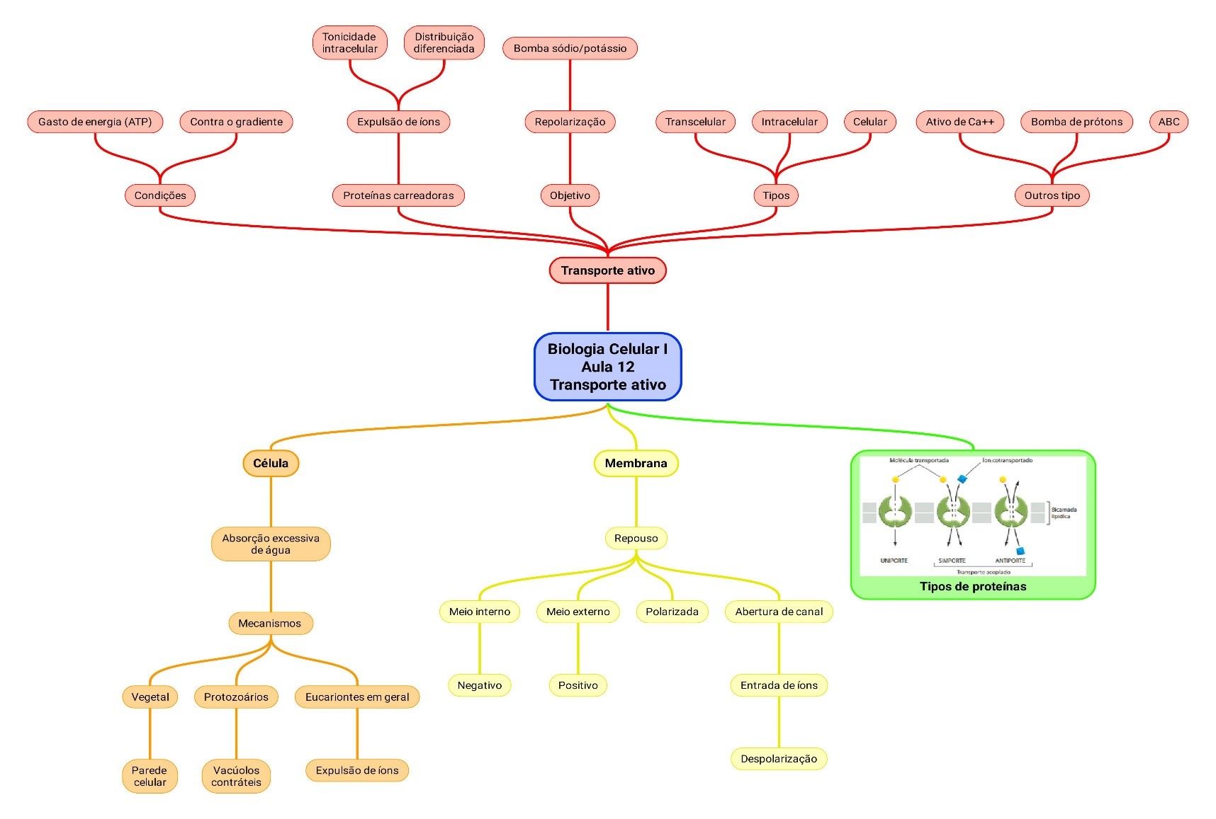 LICENCIATURA EM CIÊNCIAS BIOLÓGICAS – CEDERJ - UENF SEGUNDO PERÍODO DISCIPLINA: Biologia Celular 1 Resumo: Aula 12 – Transporte ativo · O transporte ativo contrapõe-se ao passivo em seus dois postulados básicos: 1. dá-se sempre contra o gradiente de concentração do soluto que está sendo transportado; 2. requer gasto energético (ATP) por parte da célula. · Apenas proteínas do tipo carreador são capazes de realizar transporte ativo. · A expulsão seletiva de íons por transporte ativo traz duas consequências: 1. equilíbrio da tonicidade do meio intracelular, impedindo a absorção excessiva de água por osmose (controle do volume celular) 2. estabelecimento de uma distribuição diferenciada de íons (gradiente) entre os meios intra e extracelular. · A absorção excessiva de água é evitada por vários mecanismos: (a) a presença de uma parede celular semirrígida nos vegetais, (b) vacúolos contráteis em protozoários e (c) a expulsão ativa de íons nas células eucariontes em geral. · Numa membrana em repouso, o meio externo é positivo em relação ao meio interno, pois há mais cátions no meio extracelular. Com essa configuração é dito que a membrana plasmática é polarizada. Quando os canais são abertos e ocorre a entrada de íons, passa a ocorrer a despolarização da membrana. · A despolarização sinaliza uma alteração no estado funcional da célula. Por exemplo, se for uma célula muscular, a consequência dessa mudança de sinal será a contração muscular. No caso de uma glândula, pode ser esse o sinal para a secreção de um hormônio, e assim por diante. · O papel do transporte ativo será fazer com que a célula retorne ao estado de repouso, e essa repolarização é feita por um sistema de transporte ativo chamado de bomba de sódio/potássio. Uniporte, Semiporte e Antiporte · Tipo de proteínas: 1. Uniporte: transportam apenas um tipo de molécula; 2. Semiporte: transportam simultaneamente molécula e íon. 3. Antiporte: transportam moléculas distintas em sentidos opostos Transporte intracelular e transporte transcelular · Transporte transcelular: ocorre quando da passagem da glicose e todos os nutrientes do epitélio intestinal para a circulação. · Transporte intracelular: quando moléculas são levadas de um compartimento celular para outro. (Ex: do núcleo para o citosol). · Transporte celular: Quando as moléculas são transportadas para dentro ou fora da célula através bicamada ou das proteínas das membranas. Outros tipos de transporte ativo: · Transportador ativo de Ca++ · Bomba de prótons. · Transportadores ABC. · Nem todo antiporte é feito com gasto de energia. · Um sistema antiporte aumenta a eficiência do transporte de Co2 retirado das células pelas hemácias.