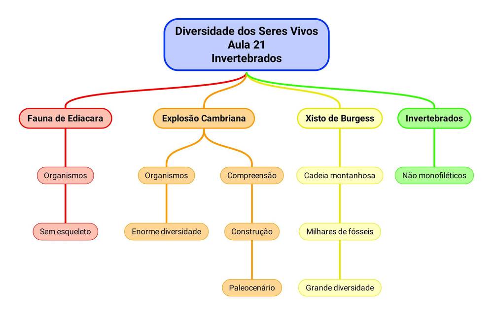 LICENCIATURA EM CIÊNCIAS BIOLÓGICAS – CEDERJ - UENF SEGUNDO PERÍODO DISCIPLINA: Diversidade dos Seres Vivos Resumo: Aula 21 – Invertebrados Fauna de Ediacara · Uma característica dos organismos da Fauna de Ediacara é que não possuíam esqueleto. · Não se sabe ao certo se estes organismos eram animais ou plantas, embora é possível que tenham sido animais. Um exemplo é a similaridade com os penatuláceos, que são membros da Classe Anthozoa, e do Filo Cnidária. Explosão do Cambriano · Estudar o Período Cambriano é um desafio interessante. O maior obstáculo não é a ausência de fósseis, mas sim a enorme diversidade deles encontradas no Cambriano. Realmente, a diversidade de fósseis do Cambriano é tão grande e, mais importante do que isso, tão diferente de tudo que conhecemos que, para muitos organismos, não temos a menor ideia de que nicho ecológico eles ocuparam. · A montagem de um Paleocenário, pode ajudar a compreender melhor a Explosão Cambriana. · Paleocenário: Uma hipótese de ecossistema ancestral ou antigo, baseado principalmente em evidências fósseis. Xisto de Burgess · O XISTO DE BURGESS é uma montanha em meio a uma cadeia chamada Montanhas Rochosas, que atravessa o Canadá. Ela abriga milhares de fósseis de organismos perfeitamente preservados que viveram há mais de 500 milhões de anos. · Os primeiros fósseis encontrados são os comuns trilobitas, presentes na totalidade de fósseis desse período. Entretanto, pouco a pouco novos fósseis foram surgindo e eles eram cada vez mais estranhos. · É importante deixar claro que os invertebrados não formam um grupo monofilético. Ou seja, invertebrados não são mais próximos filogeneticamente entre si do que qualquer invertebrado com membros de outros grupos.