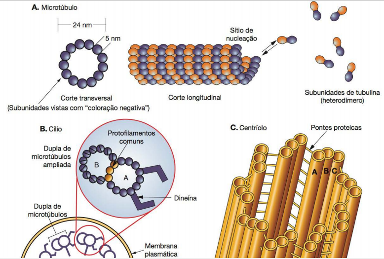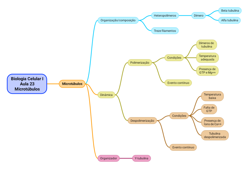 LICENCIATURA EM CIÊNCIAS BIOLÓGICAS – CEDERJ – UENF / 2º PERÍODO DISCIPLINA: Biologia Celular 1 - Aula 23: Microtúbulos · Os microtúbulos são filamentos longos e ocos, responsáveis pela formação de estruturas transitórias, como o fuso miótico, ou permanentes, como os flagelos. A forma geral e a disposição do núcleo e das organelas celulares também são determinadas pela distribuição desses filamentos. Organização geral dos microtúbulos · Como os microfilamentos, os microtúbulos também se formam pela polimerização de uma proteína globular. Porém, enquanto os microfilamentos são homopolímero de actina, os microtúbulos são heteropolímeros de duas formas da proteína tubulina, a α e a β-tubulinas . · Treze protofilamentos formam a circunferência dos microtúbulos. Cada protofilamento, por sua vez, é formado por dímeros de α e β- tubulinas alternadamente dispostos. Dinâmica de polimerização dos microtúbulos · Na maioria das células, os microtúbulos são estruturas extremamente lábeis e dinâmicas, desaparecendo e reorganizando-se rapidamente. · O período de nucleação ocorre quando são formados os primeiros protofilamentos. · Condições de polimerização de microtúbulos: 1. Presença da concentração mínima necessária de dímeros de tubulina α-β (concentração crítica); 2. Temperatura adequada (37ºC),; 3. Presença de GTP e Mg++. · Correspondentemente, existem condições de despolimerização: 1. Temperatura baixa (4ºC); 2. Falta de GTP; 3. Presença de íons Ca++ (mais uma razão para a concentração citoplasmática de cálcio se manter baixa). 4. Concentração de tubulina não polimerizada abaixo da crítica. · In vivo, as células possuem um centro organizador de microtúbulos ou centrossoma, de onde partem todos os seus microtúbulos. Em geral, os microtúbulos se orientam com a extremidade minus voltada para o centro organizador e a extremidade plus voltada para periferia celular. O centro organizador dos microtúbulos · O que define o centro organizador de microtúbulos não é a presença do centríolo, e sim uma forma específica de tubulina, a γ-tubulina, que se distribui no material pericentriolar (em torno dos centríolos). A polimerização e a despolimerização de microtúbulos são contínuas · Os microtúbulos de uma célula típica estão constantemente se alongando e encurtando, num processo conhecido como instabilidade dinâmica. · Essa instabilidade dinâmica resulta da hidrólise espontânea da molécula de GTP ligada à subunidade β da tubulina em GDP. Os microtúbulos organizam a forma das células · A forma geral das células depende da distribuição dos microtúbulos a partir do centrossomo, que, por sua vez, está sempre próximo ao núcleo, exceto durante a divisão celular · Se, por um estímulo natural (ver box) ou por micromanipulação, o centrossoma de uma célula for deslocado de sua posição, todas as organelas celulares se reposicionarão em relação a ela, inclusive o núcleo. Por essas evidências, considera-se que o centro organizador de microtúbulos corresponde ao centro da célula. Notas do resumo · Os microtúbulos podem estar associados a proteínas acessórios que aumentam sua estabilidade através da formação de pontes entre as subunidades de tubulina. · As cinesinas e dineínas são proteínas que se associam aos microtúbulos e são capazes de promover o deslizamento entre eles ou o transporte de organela e vesículas através do citoplasma, utilizando-os como trilhos. · Cílios e flagelos são estruturas motoras de protozoários e tipos celulares como espermatozóides e epitélios ciliados que conjugam em sua estrutura microtúbulos e proteínas acessórias estruturais e motoras. · Várias drogas interferem na dinâmica de polimerização e despolimerização dos microtúbulos e muitas delas são usadas na pesquisa e no tratamento de doenças como câncer e a gota.