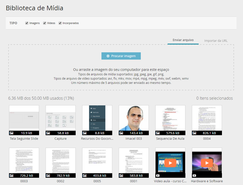 Os recursos multimídia são:IMAGENS; (As imagens podem ser um objeto incorporado ou feito upload do computador).VÍDEOS; (Os vídeos podem ser um objeto incorporado ou feito upload do computador).E OBJETOS INCORPORADOS, ou seja, objetos que são incluídos na biblioteca de arquivos pela inserção da URL.