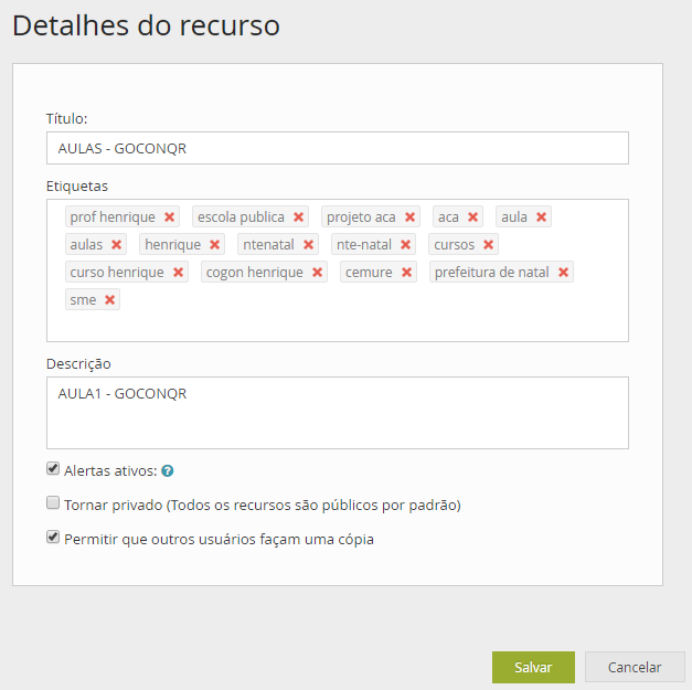OS DETALHES DOS RECURSOS SÃO: Título: Todos os recursos precisam de um título, assim como um objeto qualquer precisa de um nome. Etiquetas: São palavras-chave que possibilita o usuário de encontrar o seu material mais rapidamente. Descrição: A descrição seria uma maneira de você colocar para o usuário informações breves do recurso. Alertas Ativos: Com este recurso ativo ou marcado você pode receber notificações. Tornar ou não o recurso privados: Somente teremos acesso se tivermos contas premium. Permitir que outros usuários façam cópia. Tudo o que é bom pode ser copiado, pois não somos eternos. Em todos os recursos existem DETALHES que precisam ser preenchidos para que os mesmos possam ser publicados.