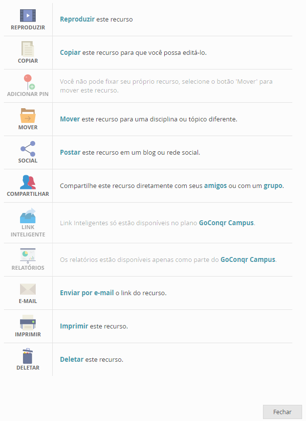 Ao clicar no botão AÇÕES você terá acesso a esta tela que lhe proporcionará diversos comandos. Obs.: De alguns comandos não iremos falar para não sermos redundantes. Mas em caso de dúvida entre em contato conosco. REPRODUZIR. Ao ser clicado o quiz ou qualquer outro recurso irá para a tela de REPRODUÇÃO que é a tela que o aluno ou qualquer outro usuário irá encontrar quando clicar no link do seu QUIZ. O PIN, é um comando utilizado para armazenar ou vincular recursos criados por outras pessoas ao seu banco. SOCIAL, usamos quando queremos socializar ou enviar o recurso criado para qualquer outro usuário em qualquer rede social. COMPARTILHAR, serve para enviarmos para amigos ou grupos vinculados a nós.