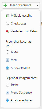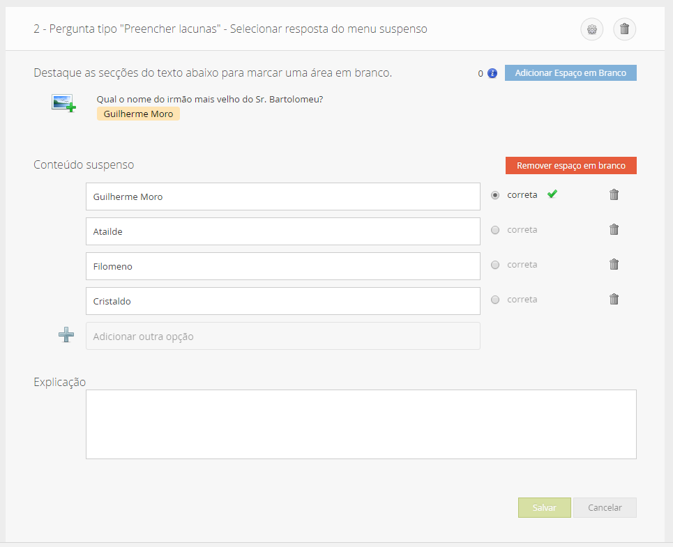 Nesse exemplo, colocamos a Alternativa correta selecionamos e colocamos outras alternativas. A mesma não ira aparecer como alternativa A, mas sim como um bloco de alternativas em uma tela drop-down que o aluno irá escolher a resposta correta clicando sobre ela.
