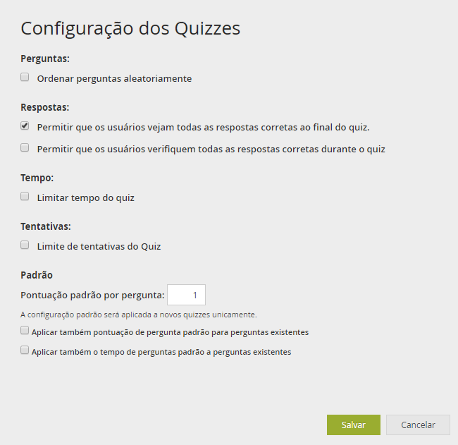 Existem inúmeras possibilidades ao desenvolvermos uma alternativa. As configurações das mesmas podem ser individualizadas ou coletivas, ou seja, podemos ter uma configuração para todas as questões ou para uma questão apenas. Vejamos as configurações quais são: