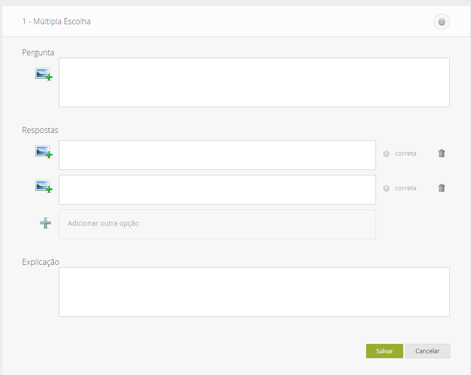 Observe que existe um espaço para digitação ou inserção da pergunta e o local para inserção das alternativas. Procure colocar número nas questões, pois a plataforma não posta automaticamente. Da mesma forma nas letras das alternativas e nunca esqueça de clicar na alternativa correta. EXCLUIR ALTERNATIVA - Basta clicar na LIXEIRA que está ao lado da alternativa. INSERIR ALTERNATIVA - Basta clicar no sinal de (+) que está abaixo da última alternativa. INSERIR IMAGEM - Clica na IMAGEM que tem um sinal de (+).