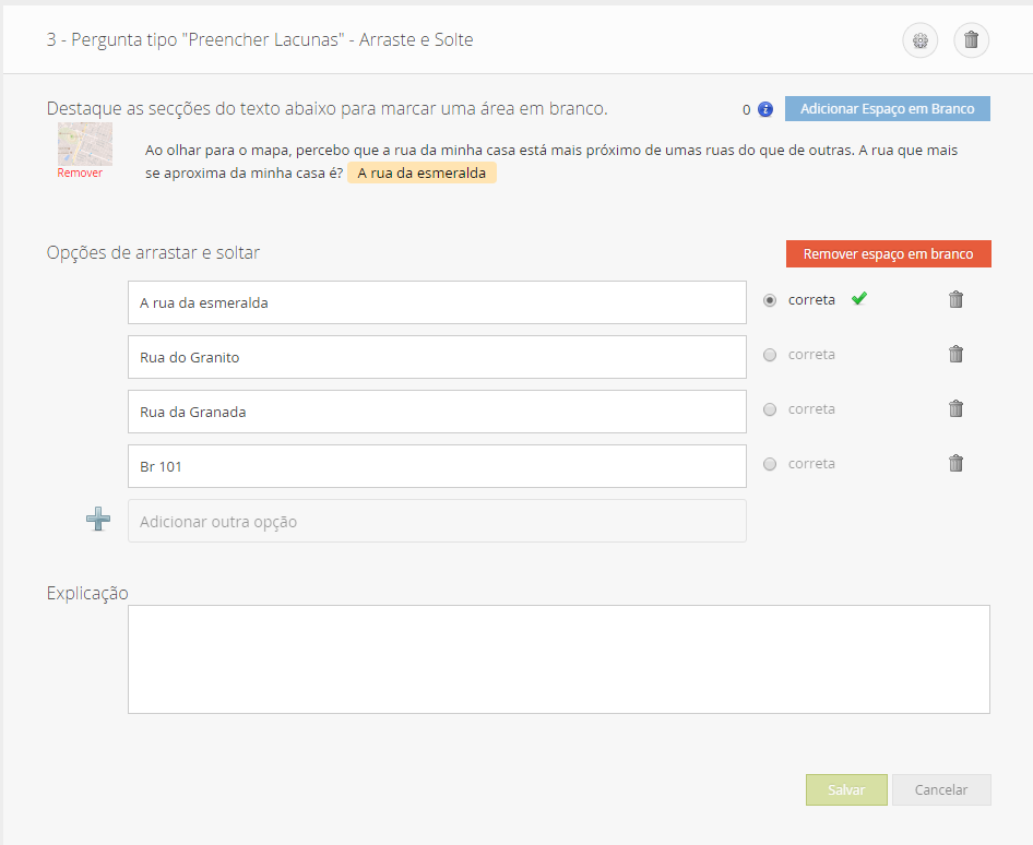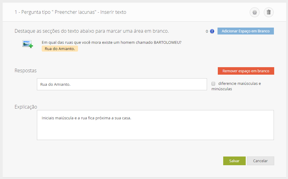 Observe que o texto Rua do Amianto foi selecionado. Ela será a resposta que o aluno deverá inserir. Tenha muito cuidado se você marcar o quadrinho diferencie maiúsculas e minúsculas, pois o aluno terá que digitar exatamente como foi digitado por você.