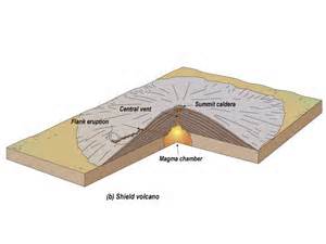 VOLCANIC LANDFORMSExtrusiveVolcanic coneThey form from magma rising through the crust through the central vent. Once it reaches the surface, cooling magma will harden around the central vent building up to form a volcanic cone. The type of cone will depend on the type of lava flowing from it.a) Shield volcano: these form when the basic lave (55% silica) erupts from a central vent. This lava is very fluid and it is capable of flowing great distances before it solidifies. It will therefore build into a wide cone with gentle slopes. From the air it resembles a warrior shield e.g. The Hawaiian islands.
