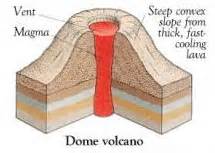b) Dome volcanoes: form when acidic lava (high in silica) erupts from a central vent. This usually occurs at a destructive plate boundary. It is steeply sloping beacuse the lava is thick and viscous and barely able to flow. This lava is very explosive e.g. Puy de Dome in France