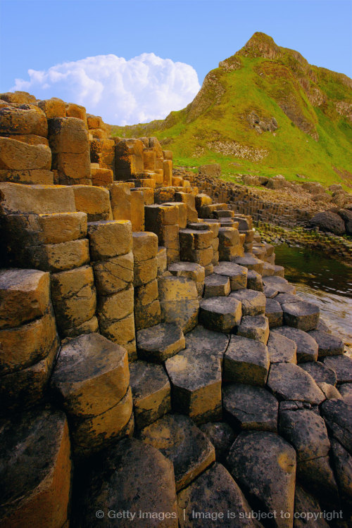 2. Lava plateau / basalt plateauLava plateaux are flat topped upland areas composed of basalt rock. They form as a result of fissure eruptions. This is where the lava pours out of long cracks in the crust, e.g. a constructive boundary. The lava is basic in nature (low in silica, runny - approx. 55% silica) this means it is very fluid and capable of flowing great distances before it cools. Over time with each successive lava flow it builds up to form a huge flat-topped upland, As the lava cools it contracts slightly and may form distinctive polygonal shaped columns ranging from 3-12 sides e.g. the Antrim-Derry Plateau of which the Giant's Causeway is part of. It is the largest lava plateau in Europe and formed 60 million years ago. Lava filled the river bed and cooled slowly, cracking hexagonal columns.