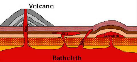 Sill - Forms when magma enters and cools horizontally in the bedding planes of the orck (horizontal sheet of granite).Dyke - Forms when magma enters and cools in the vertical fissures of the crust.Laccolith - Forms when magma pushes overlying rock upwards. The magma cools and hardens.Lopolith - Forms when magma pushes the underlying rock downwards. It cools and hardens - bowl-shaped.