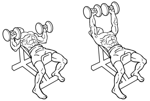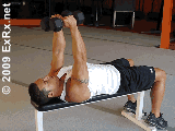 Lower dumbbells to sides until chest muscles are stretched with elbows fixed in slightly bent position. Bring dumbbells together in hugging motion until dumbbells are nearly together. Repeat.