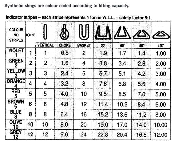 VIOLET - WLL of ONE TONNE GREEN - WLL of TWO TONNES YELLOW - WLL of THREE TONNES ORANGE - WLL of FOUR TONNES RED - WLL of FIVE TONNES BROWN - WLL of SIX TONNES BLUE - WLL of EIGHT TONNES OLIVE - WLL of TEN TONNES GREY - WLL of TWELVE TONNES