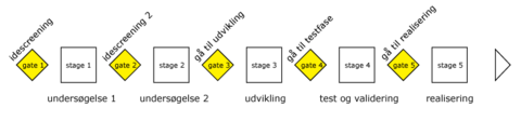Modellens trin Gate 1: Ideerne undersøges, granskes og screenes. Der træffes beslutning hvilke ideer man arbejder videre med. Stage 1: Ideen undersøges konkret. Hvilke produkter peger det på? Hvilke markedspotentialer? Gate 2: Ideerne udvælges endeligt. Stage 2: Udviklingsprojektet planlægges. Koncept, mål og rammer defineres. Gate 3: Det vedtagne projekt skal have grønt lys til fortsættelse. Stage 3: Prototyper udvikles. Egentlig produktudvikling. Forretningsmodel udvikles parallelt. Gate 4: Produktet godkendes før test. Stage 4: Test af produkt, produktionsfasciliteter, distribution og alle de procesparametre, der er beskrevet i forretningsplanen. Gate 5: Det besluttes om produktet skal frigives, lanceres og markedsføres. Stage 5: Produktet lanceres og produktionen sættes i gang.