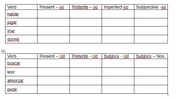 Spanish 3 Semester 1 2014 Señor Abels Exam Date: Thursday, Dec 18th 8:15-9:50 Test composition:The test will cover vocabulary through extended matching (30%) and in-context multiple choice questions. Appropriate conjugation will be evaluated by conjugating a verb into a grid (20%), see below, as well as recognizing appropriate context. The multiple choice section (40%) will cover the remaining grammar, vocabulary association, and in context choices for the verb conjugation. The final 10% of the test demonstrates answering questions in complete sentences.