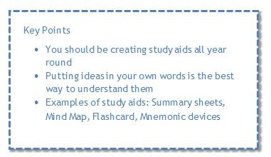 When you’re in class, taking notes can be very beneficial. However, depending on what type of learner you are, you may approach things differently. Some people like to take down what the teacher/lecturer says word for word, some put it in their own language and some simply prefer to listen[1]. You should know which style suits you best as this will help your study patterns. When it comes down to actually studying you shouldn’t just sit there reading your text book from beginning to end. You should always be in the process of creating a study resource; something you can return to again and revise later. This could be a summary sheet, a note, a flashcard deck, a Mind Map, acronyms or any number of other tools that help you study.When reading from a text you shouldn’t read passively. You should be actively engaged; highlighting keywords and phrases, making notes in the margins and taking down notes in your own words. Doing these simple tasks will greatly improve your retention of the topic covered. It is better to cover 5 pages actively then to passively read a whole chapter. You’ll get more out of it in the long run.Also, a tip on highlighting: you shouldn’t highlight more than one sentence per paragraph as if you highlight too much, it becomes meaningless—only highlight the most important parts.If you can put notes into your own words this shows that you have fully understood the concepts. This will help you when it comes to revising it as it is easier to recall something written in your own language. Flashcards are perfect for memorizing vocab lists, definitions or formulas and can be used for a myriad of other topics. Mnemonic devices are an easy way of learning of lists. A famous example is ‘Richard Of York Gave Battle In Vain’ which gives the first letter of each colour of rainbow: Red, Orange, Yellow, Green, Blue, Indigo, Violet. Mind Maps can be used for representing your notes visually but also for brainstorming and planning sample essay-style answers. Simply have each node represent one paragraph and include all the pertinent information in nodes off that. Although it may seem easier and more productive to use materials from teachers/lecturers and other professionals, creating your own study resources so that they are written in your words, and have your emphasis on what is important, will be an immense help when it comes to studying and revising them later on and closer to the exam date.Keeping on top of your creation of study aids as you engage with new content on a daily basis in class will mean less study in the long run and more productive study over time. This can only lead to better results and greater motivation.Creating different study aids as you go along is the equivalent of putting one foot in front of the other as you travel along the road. It’s not glamorous but it is what gets you from A to B… or hopefully in this instance B to A!