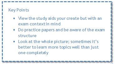 By the time your exams have come you should be able to use a number of‘trigger’ words. These are words that encapsulate a whole topic or area, when you come across them they should trigger a whole host of different ideas to unfurl in your head without the use of any study resources. When this occurs naturally you know you have covered a topic enough and that you’re prepared for your exams