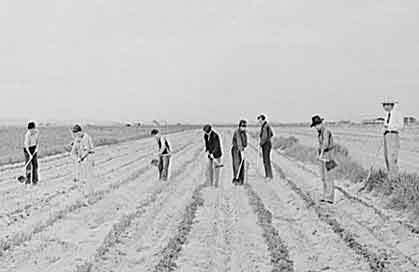Migrant FarmersAdded to the man-made financial problems were natural ones. A series of droughts in southern mid-western states like Kansas, Oklahoma and Texas led to failed harvests and dried-up land. Farmers were forced to move off their land: they couldn't repay the bank-loans which had helped buy the farms and had to sell what they owned to pay their debts. Many economic migrants headed west to 'Golden' California, thinking there would be land going spare, but the Californians turned many back, fearing they would be over-run. The refuges had nowhere to go back to, so they set up home in huge camps in the California valleys - living in shacks of cardboard and old metal - and sought work as casual farmhands.