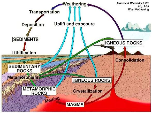 The rock cycle and how it worksThe rock cycle is the name given to the process where rocks are formed, changed, broken and melted as shown in the picture on the left. It is the movement of tectonic plates that makes the rock cycle happen. Hot magma can cool to form igneous rocks. Fast cooling on the surface makes basalt and slow cooling inside the crust makes granite. When tectonic plates collide the enormous forces can produce metamorphic rocks and rocks inside the Earth's crust can become pushed up onto the surface by a process called uplift. Surface rocks are exposed to weathering and erosion which makes sediments. Burial of sediments produces sedimentary rock inside the Earth's crust. Any rock in the crust can be pushed to the surface by uplift or dragged down towards the mantle where it can melt and form new magma.