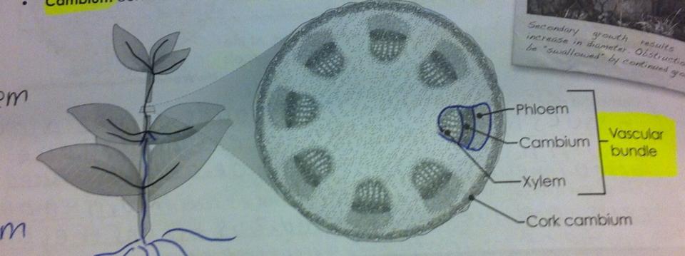 CambiumThe first stage in secondary growth occurs when the cambium in vascular bundles grows (by mitosis) into a complete cylinder around the stem. The cambium also thickens. Undifferentiated cells on both sides of the cambium become new tissue.
