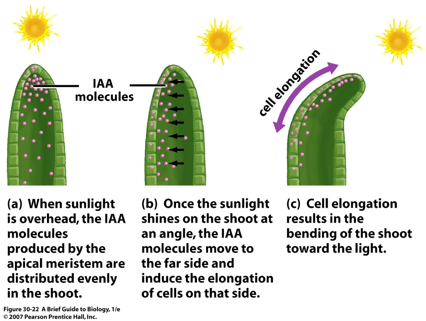 Plants are able to control their rate and direction of growth using hormones. Hormones also determine the formation of flowers, stems, leaves, the shedding of leaves, and the development and ripening of fruit. There are five major plant hormones, one of which is called auxin. Auxin is composed of indoleacetic acid (IAA). Auxin is produced in cells at the stem and root tips and transported to regions of growth. Auxin causes shoot cells to elongate but inhibits elongation in root cells.In 1880 Charles Darwin and his son Francis found that coleoptiles only bend towards the light when their tips are exposed. Coleoptiles are a sheath of tissue found in members of the grass family which cover the emerging shoot.