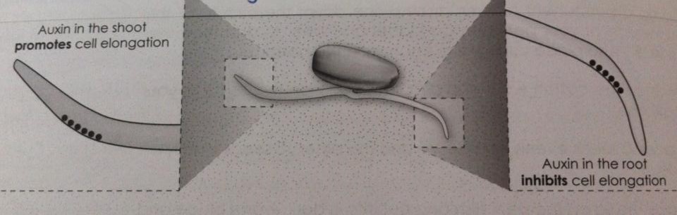 Geotropism refers to a plant's response to gravity. If a seed is planted on its side or upside down, the plumule (shoot) and radical (root) always grow in the correct directions. In roots, auxin inhibits the elongation of cells as there is no light so auxin doesn't do anything.