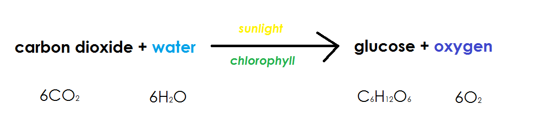 Photosynthesis is the process that converts the sunlight (solar energy) into chemical energy to feed plants. The raw materials are CO2 and H2O. In the presence of sunlight and chlorophyll they react to form the product glucose and the waste product O2.