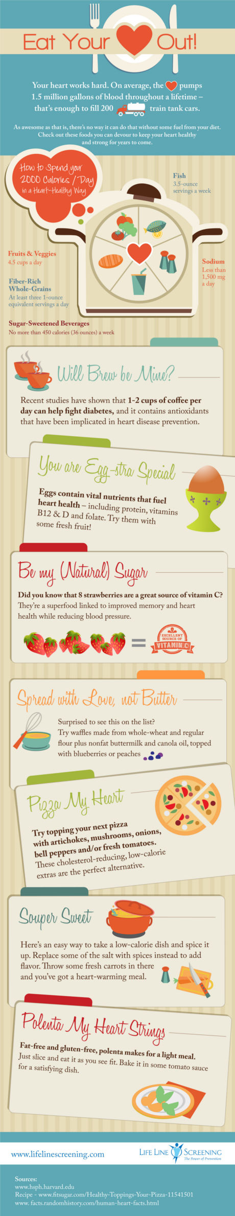 Here is an infographic which is useful on how to keep your heart healthy. The role of the diet in the development of coronary heart disease A healthy, well balanced diet reduces the risk of developing coronary heart disease because it helps: Maintain a healthy weight Lower blood cholesterol levels Keep blood pressure within safe limits Prevent atherosclerosis There are many simple changes we can make to our diet to help keep the heart healthy. A heart healthy diet works in a number of ways. For example, it may help reduce cholesterol levels and lower blood pressure. Here are some easy tips that can reduce the risk of heart disease.Enjoy a variety of fruit and vegetablesFruit and vegetables are packed with vitamins, minerals and other substances that help protect your heart. They also pack fibre and most are virtually fat free. Aim to fit in at least five portions of these foods each day. If you find this difficult, try including a glass of pure orange juice each morning and eating fruit or chopped vegetables for snacks. Feast of fish The healthy oil found in fish reduces your risk of a heart attack in lots of ways. Eating more fish isn't difficult; it can be easy as having a salmon sandwich or sardines on toast. Try to include the following types of oil-rich fish in your diet once a week (and don't forget the canned versions): Salmon Herring Sardines Mackerel Pilchards Trout Kippers Tuna (fresh tuna only) Focus on Fats While all types of fats are high in calories, some fats can also raise cholesterol levels. The main culprit is saturated fats, and it's found in fatty meat, dairy foods, cakes, pastries and palm oil. Easy ways to reduce your intake of this unhealthy fat include: Make the change to reduced-fat dairy products, e.g semi skimmed milk Use soft spreads made from vegetable oil, such as rapeseed or olive oil, rather than choosing butter, and use sparingly Trim the fat from meat and the skin from chicken Limit your intake of fast fried food, meat products like sausages, pies and streaky bacon Go for snacks which are low in saturated fat such as fruit, bread, nuts, seeds, low fat yogurt, vegetables and cereals. General tips for a healthy heart Go for a Mediterranean-style diet, with lots of vegetables and fruits along with fish and small amounts of lean meat. Include some wholegrain foods in your daily diet, for example, wholegrain cereals, bread, rice and pasta Watch out for trans fats, which can also raise your cholesterol levels, found in processed foods e,g hard margarine, pastry, cakes and biscuits Skip the salt Keep your alcohol intake within sensible limits Stay weight wise Aim to be active everyday Avoid smoking
