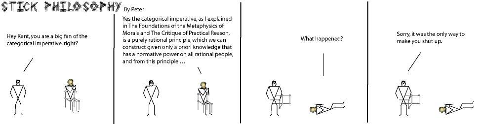For Kant, the basis of duty is what he calls "categorical imperatives". To explain this he distinguishes real ethics from "hypothetical imperatives" - instructions which have conditions attached to them. Kant seperates hypothetical imperatives into two halves the condition (Antecedent) and the instruction based off of that condition (Consequent). For example:Antecedent: If you want to get in shape Consequent: then you should get some exercise. Therefore a hypothetical imperative is the prescription of an action based on a hypothetical desired outcome. For Kant the whole point of ethics is that it is not based on our desires or circumstances. A moral law is a categorical imperative because it has no antecedent; there is no "if" part of the command. Duties are binding for their own sake.