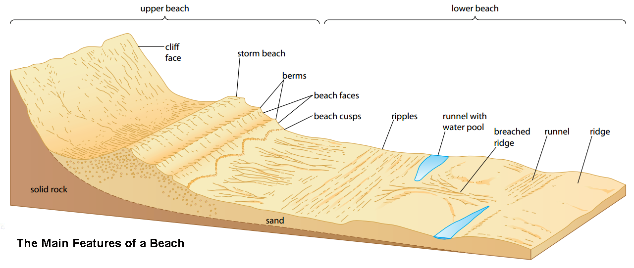 Beaches Beaches are mainly constructed of sand and shingle.Ridges and Runnels form when the sand becomes compact when its wet and the backwash carries material down the beach. Ridges and Runnels run parallel to the shoreline and are broken by channels that drain.Spring tides often form a storm beach which consists of the largest material thrown up by the strong swash of the larger waves. Following tides often cannot reach these features therefore they remain largely untouched. There are often a series of smaller ridges formed beneath the storm ridge known as berms. These mark the successive high tides that follow the spring tide through to the neap tide.Cusps are crescent-shaped indentations that form on beaches of mixed sand and shingle. They are formed where there is a junction between sand and shingle. Once the curving shape is created, swash is concentrated in the small bay that forms in the centre of the cusp. This creates a stronger backwash that removes material down the beach. Below the cusps, ripples are developed on the sand by wave action or tidal currents.