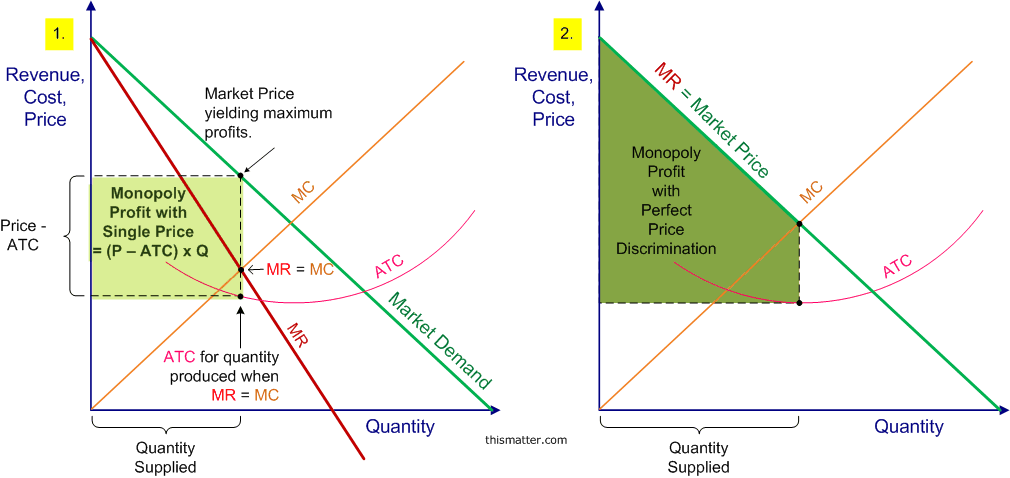 MONOPOLY: a competitive structure where there is only 1 seller of a particular product with no close substitutes Monopolists are price-searchers. The demand curve is downward sloping, so they must lower price to sell additional units. Elasticity of Demand:-When marginal revenue is positive, demand curve is elastic. It's positive to the left of the demand line where MR crosses with the x axis (vertical line upwards)-Monopolists will always choose to produce in the elastic portion of the demand curve because producing higher quantities would reduce TR while adding to TCProblems with Monopolies: In order to maximize profits, monopolists end up producing less output and charging a higher price than a competitive market would. By charging more and producing less, monopolists takes away consumer and producer surplus - this is called dead weight loss. Monopolists aren't efficient! They fail to achieve productive efficiency by not producing at minimum ATC, and allocative efficiency by not charging a price equal to MC.