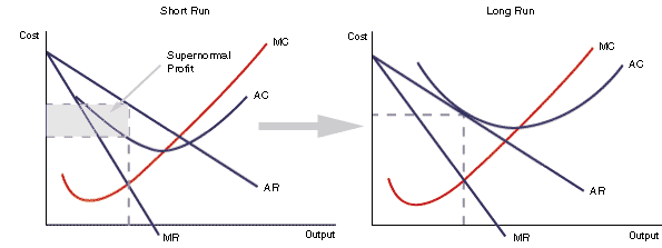 NOTE: In monopolistic competition, the demand curve (AR) is more elastic due to the presence of substitutes!In the long run, economic profits cause new firms to enter the market. This causes... The demand curve of existing profits to shift left (aka the substitute effect) Zero Economic Profit occurs (when ATC = AR at the quantity being produced) HOWEVER, even in the long run, the firm is still sort of inefficient because price (P) does not equal MC and the firm doesn't produce at minimum ATC. This is known as allocative inefficiency.