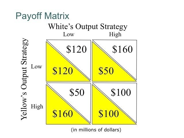 In the Payoff Matrix above... Yellow's dominant strategy is a high output White's dominant strategy is also a high output So, the Nash Equilibrium exists in the bottom right hand corner, with both outputs being high, and both firms making $100 million. This is because neither could be better off choosing an option other than high, so no matter what happens, that box should be the production.