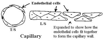 CAPILLARIESCapillaries are tiny, much-branched vessels. Their walls are made of a single layer of endothelium cells (one cell thick). Capillary walls are permeable so they allow for the exchange of materials between the blood and body tissues.-site of exchange between blood and tissue cells-one cell thick --> rapid diffusion-tissue cells are close to capillaries for sufficient exchange-blood flow in capillaries is slow for effective exchange.