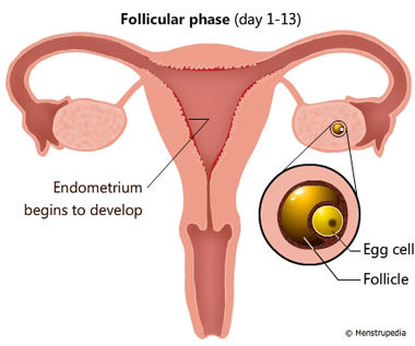 stage 2: follicular stage (Days 6-13) Several eggs mature within a follicle follicle manufacture and secrete oestrogen rise in oestrogen result in lining thickening of uterus. follicle moves to the surface of the ovary