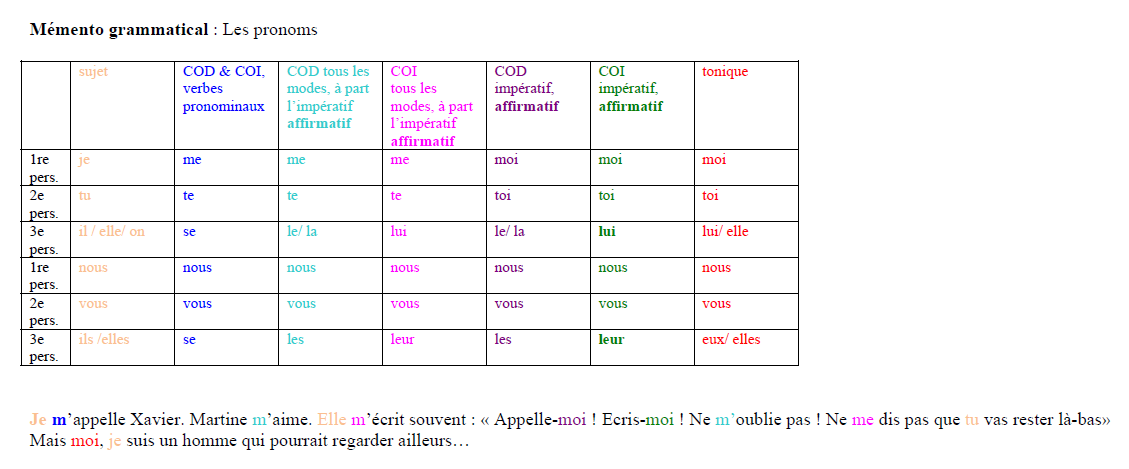 Les pronoms remplacent un nom de personne ou de chose. �Les pronoms compléments d’objet direct (CODs):DIRECT OBJECTS - indicate the object of the action expressed by the verbSujet + verbe + quelqu'un/quelque chose (OBJET DIRECT) eg. Je vois AmelieDirect Objects: refer to people or things (eg. Elle aime ses enfants) are preceded by a definite article (eg. Je vois la voiture) OR a demonstratif (eg. ce) are NOT preceded by prepositions. (eg. Je parle à Madison. A Madison is NOT a direct object) �Direct Object Pronouns take the place of a direct object in a sentence.The direct object pronouns are: Me - me You - te He/One/It - le She/It - la Us - nous You (pl) - vous Them - les Direct object pronouns are placed between the subject and the verb EXCEPT WHEN USED WITH THE AFFIRMED IMPERATIVE, in which case the tonic pronouns are used instead of the "me" and "te" forms and all pronouns are hyphenated to the end of the verb.Examples:Elle met les fleures sur la table.- Elle les met sur la table.Vous écrivez une lettre.- Vous l'écrivez.J'aime Alexi.- Je l'aime.Vous vous levez.- Levez-vous!Vous allez le surveiller.- Surveillez-le!Les pronoms compléments d’objet indirect (COIs):INDIRECT OBJECTS - use prepositions to indicate the object of the action expressed by the verb OR describe/add meaning to the action expressed by the verbSujet + verbe +preposition + quelqu'un (OBJET INDIRECT)eg. Je parle à AmelieOUSujet + verbe + quelque chose (OBJET DIRECT) + preposition + quelqu'un (OBJET INDIRECT) eg. J'écris un texto à ma mère Direct Objects: refer to animate objects (people, animals, ...) (eg. Ella téléphone à son petit ami.) are preceded by prepositions. (eg. Je me promene avec Madison. Nous envoyons des lettres à Jaques.) Indirect Object Pronouns take the place of an indirect object in a sentence.The indirect object pronouns are: Me/ to me - me You/ to you - te Him/to him/her/to her - lui Us/to us - nous You/ to you (pl) - vous Them/ to them - leur Indirect object pronouns are placed between the subject and the verb EXCEPT WHEN USED WITH THE AFFIRMED IMPERATIVE, in which case the tonic pronouns are used instead of the "me" and "te" forms and all pronouns are hyphenated to the end of the verb.Examples:J'écrirai à toi chaque jour.- Je t’écrirai chaque jour.J'explique à vous la situation.- Je vous explique la situation.Nous avons donné des conseils à Maddy et Elinor.- Nous leur avons donné des conseils.Tu te parles.- Parle-toi!Vous allez lui écrire.- Ecrivez-lui…NOTE: With certian verbs followed by the preposition à + name of a person, the indirect object pronouns are not used in fron of the verb. Rather, the preposition à is repeated with the emphatic pronoun (le pronom tonique) �eg. Il s’adresse à ta mère.- Il s’adresse à elle .Je pense à Dion.- Je pense à lui.Les pronoms toniques:Tonic (Emphatic) Pronouns replace the name of a person or animal in a sentence.The tonic pronouns are: Me - me You - te Him - lui Her - elle One - soi Us- nous You (pl) - vous Them (m) - eux Them (f) - elles Tonic pronouns are used: to place emphasis on the subjecteg. Lui, il aime manger. Moi, j'aime lire les romans. in compound subjectseg. Toi et moi, nous faisons le nécessaire after a prepositioneg. Viens avec moi. Tu peux compter sur lui. C’est juste derrière vous. after the negative "ne___que"eg. Je n'ai vu que lui. with "-même" to indicate "oneself"eg. Elle aimerait mieux le faire elle-même. after any relexive verb followed by àeg. Le chat s’est habitué à moi. with the expression "être à"eg. Ce stylo est à moi! with certian verbs that do not take indirect object pronouns when followed by the preposition à + name of a person (as mentioned above).eg. Écris à moi si tu as des questions. Le pronom "y":Like an adverb, "y" replaces the names of places that are preceeded by a pronoun.Sujet + verbe + preposition + nom de lieu [phrase remplacer par "y"]eg. Je sors à la discothèque. The pronoun "y" is placed between the subject and the verb Examples:Je vais à la plage- J’y vais �Elle interprète une pianiste dans le film- Elle y interprète une pianiste Like a pronoun, "y" replaces indirect objects that represent a thing.Sujet + verbe + preposition + une chose [OBJET INDIRECT]eg. Il a répondu à la question.It is also used with verbs that utilise the preposition à at the end.Sujet + [VERBE SUIVI PAR à] + .... eg. Il faut s’habituer à toutes les exceptions aux règles grammaticales .The pronoun "y" is placed between the subject and the verb. Examples: �Je m’intéresse beaucoup à la littérature. - Je m’y intéresse beaucoup.Il faut s’habituer à toutes les exceptions aux règles grammaticales- Il faut s’y habituer Le pronom "en":The pronoun "en" replaces phrases and expressions beginning with "de". It is placed between the subject and the verb."En" is used: to replace de + name of a thingeg. J'ai besoin de quelques semaines de vacances = J'en ai besoin. to replace infinitive + deeg. Je mange du pain. = J'en mange. to replace nouns preceeeded by an indefinite articleeg. J'ai offert un livre = J'en ai offert un. with verbs followed by deeg. Je n'ai pas l'habitude de le faire = Je n'en ai pas l'habitude. with expressions formed with avoir/etre + deeg. J'ai peur de chiens = J'en ai peur.