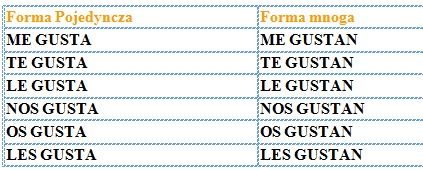 Forma Pojedyncza ME GUSTA TE GUSTA LE GUSTA NOS GUSTA OS GUSTA LES GUSTA Forma mnoga ME GUSTAN TE GUSTAN LE GUSTAN NOS GUSTAN OS GUSTAN LES GUSTAN