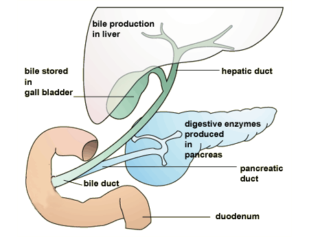 After the stomach, food travels to the small intestine. The enzymes in the small intestine work best in alkaline conditions, but the food is acidic after being in the stomach. Bile is an alkaline substance produced by the liver and stored in the gall bladder. It is secreted into the small intestine, where it emulsifies fats. This is important, because it provides a larger surface area in which the lipases can work.http://www.abpischools.org.uk/res/coResourceImport/modules/dietanddigestion/fullscreenflash6-2.cfmhttp://www.biologyinmotion.com/bile/
