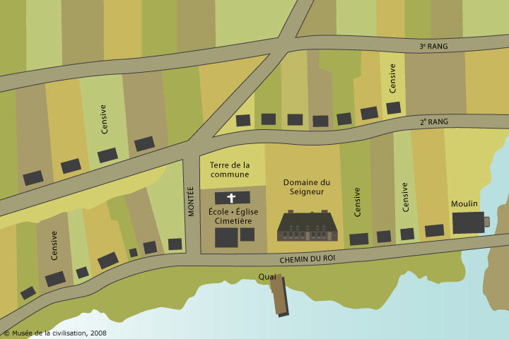 À partir de 1627, les terres de la Nouvelle-France sont concédées de la même façon qu'en France, c'est-à-dire selon les règles du régime seigneurial, (divisées en seigneuries qui sont à leur tour divisées en censives). Les seigneuries sont principalement situées en bordure du Saint-Laurent et se prolongent vers l'intérieur des terres. Les censives sont donc perpendiculaires au cours d'eau.