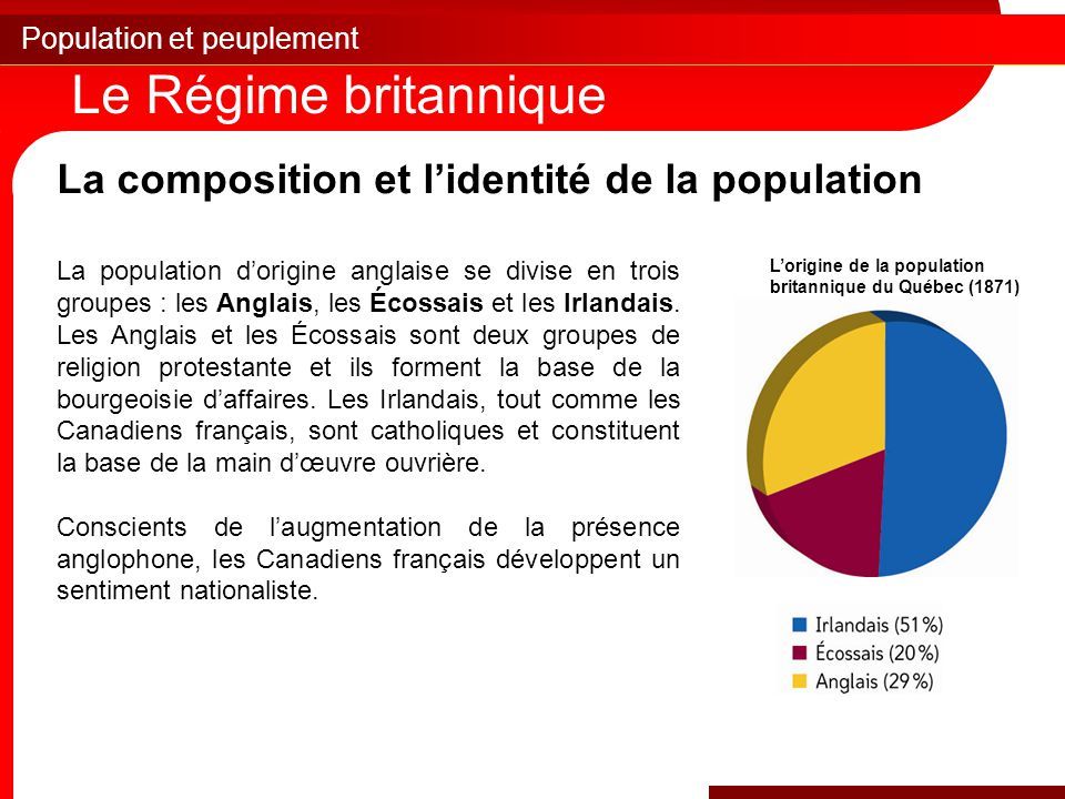 L'arrivée massive d'immigrants d'origine britannique renverse le rapport démographique entre francophones et anglophones dans les Canadas. Les Canadiens français restent toutefois majoritaires. En 1851, ils représentent 75% de la population.