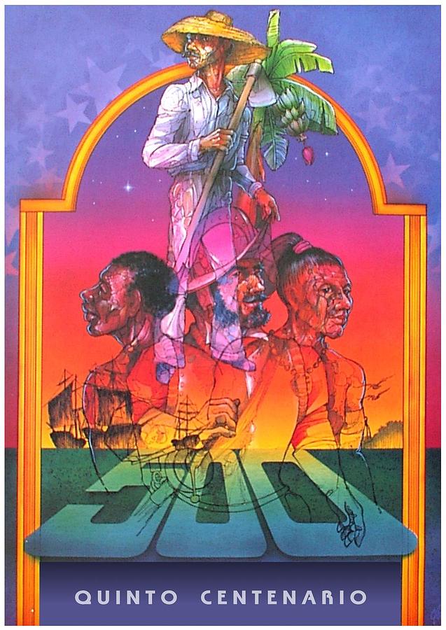 This painting shows a Spanish conquistador, a Native American, and an African showing that Puerto Rico has a very diverse group of people.