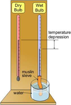 Humidity is measured using a Hygrometer A common type of hygrometer is a wet and dry bulb thermometer It is expressed as a %. 100% is the maximum