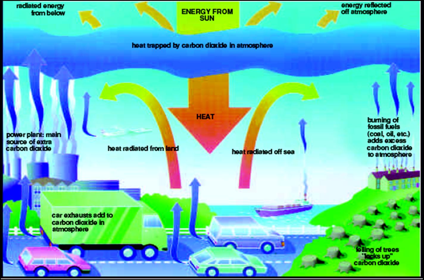Carbon dioxide and methane are Greenhouse gases in the atmosphere The amount of these gases has increased a lot in recent years Therefore, more of the sun's heat is being trapped in the atmosphere This is making the earth warmer. This is called Global Warming
