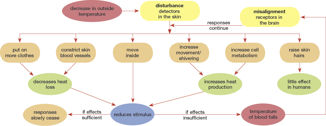 Distinguish between ectotherms, heterotherms and endothermsEctotherms are generally unable to raise their body temperature by internal heat production, they are animals other then birds and mammals, they loose their body temperature to the environment rapidly, but they do not use much energy compared to endotherms but use more energy but do not loose their body temperature to the environment as rapidly. Endotherms maintain a constant body temperature that is generally higher then that of their surroundings, they create heat by internal metabolic heat production, they are mammals and birds. Heterothems are ecotherms that can stay warmer than the temperature which they live in, they can function as endotherms generating metabolic heat, the animals that can do this are some insects, some fish and some sharksExplain how disturbance and misalignment detectors work together in the negative feedback control of body temperature in mammalsNegative feedback is stimulus-response mechanisms in which the response produced reduces the effect of the original stimulus (response provides feed back that has a negative effect on the stimulus). Disturbance detectors in the skin initiates regulatory responses, if they fail to work and the temperature of the blood falls misalignment detectors in the brain will continue the responses until temperature reverts to normal. (Picture at bottom)List the factors that influence that rate of heat exchange The effective temperature difference between the animal and the temperature of the environment. The area of exposed surface. The efficiency of any insulation against heat exchange Physiological processes involving evaporation and circulatory changes. Describe how heat is lost and gained by endothermic animalsHeat is gained by endothermic animals by internal metabolic heat production, they have insulating features such as feather and fur, this is to trap in a layer of warm air keeping the endothermic animal warm. They use behavioural and physiological mechanisms to regulate heat loss of metabolic heat. Heat is lost by evaporative cooling such as sweating and panting. Sweating has salts and important minerals, when the sweat is at a low rate it is reabsorbed through the skin before passing off the body, if the sweating is increased then the body cannot reabsorb the minerals and the body looses those resources. Panting gets rid of hot air from the body and does not loose important resources. Physiological ways such as circulatory changes and counter current arrangements. Use examples to illustrate the adaptations that help organisms regulate heat exchange with their environment Lizard basking in sun - behavioural adaptation Shivering - physiological adaptation feathers and fur insulating - structural adaptation huddling - behavioural adaptation counter current arrangements of blood vessels, and circulatory changes - physiological adaptation. List the roles played by the circulatory system in temperature regulation in endothermsThe roles that circulatory system plays in temperature regulation in endotherms are selective constriction or dilution of blood vessels in the skin and in heat-generating organs, such as muscle. Which allows restriction of heat loss from blood vessels. The circulatory system plays a role in conserving temperature through counter current heat exchange, where cold blood runs in the opposite direction of warm blood and as the warm and the cold blood pass, the warm blood then transfers its heat to the cold blood regulating temperature. Contrast how salt and water balance is maintained in freshwater and marine bony fishesIn marine environments the concentrations of body fluids of marine fish is similar to that of sea, and in fresh water the concentration of body fluids of freshwater fishes is similar to that of the water, this reduces the osmotic gradient between the fish and its outside environment , which reduces that osmotic input of water into the fish. In marine bony fish are decedents of freshwater fish which means that the concentrations of their bodily fluids are more dilute then that of the sea which the live in. The body fluids of freshwater fishes are more concentrated than the water in which they live in, and marine bony fishes are less concentrated than sea water, both fishes are under osmotic stress. List the ways that terrestrial animals gain and lose water To gain water they consume water once they experience thirst, it can be gained throught food, is gained through cellular respiration and through behavioural means water is conserved. Terrestrial animals lose water through breathing by evaporation, sweating Describe how the mammalian kidney produces concentrated urineThe mammalian kidney can produce concentrated urine by actively pumping salts into the medulla of the kidney, and because of the counter-current arrangement of the loop of Henle and of blood vessels in the medulla. The loop of Henle is related to the size of the salt concentration gradient that can be generated in the medulla of the kidney, the longer the loop the larger the higher salt concentration can be achieved. Describe some adaptations that enable terrestrial mammals to minimise water loss A larger loop of Henle to allow for more concentrated urine, and less water loss. To be nocturnal to restrain from physical activity in the day