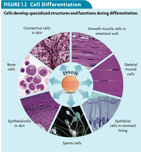 Differentiation Differentiation is the process by which committed cells acquire the structures and functions of highly specialized cells. Differentiation occurs because specific genes in each cell are turned on and off in a complex, regulated pattern. The different structures of these specialized cells, such as those shown in FIGURE 1.2, allow them to perform specific functions within the body. Task: In your group give one example of how specialization help cells perform a specific function.