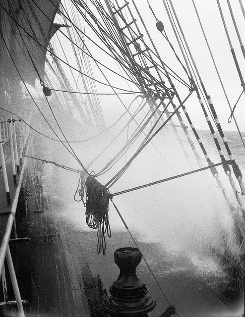Storm op zee de benen stevig op het dek het hoofd geheven in de nek. STORM op zee!