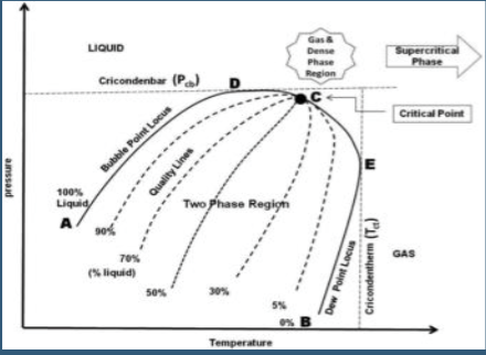 Phase Behavior hydrocarbons can exist as a vapor a liquid or a mixture of both. Important Points on the phase diagram: Bubble Point: the point at which the first drop of liquid mixture begins to vaporize Dew Point: the point at which the first drop of gaseous mixture begins to condense Critical Point: is the state of pressure and temperature at which all intensive properties of the gas and liquid phases are equal The limits where the two phases of gas and liquid mixtures can also coexist must be defined as: Circondentherm (Tct): maximum temperature at which two phases; liquid and vapor can coexist. above this temperature no liquid can be formed regardless of the pressure Circondenbar (Pcb): maximum pressure at which two phases; liquid and vapor can coexist. above this pressure no gas can be formed regardless of temperature Quality lines: the pressure and temperature conditions for constant percentage volumes of liquids. The Equation of state: determines the thermodynamic state of the liquid as it is transported through a pipeline. Five Universally accepted methods for predicting fluid properties for gas and liquid (slide 9)