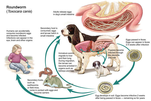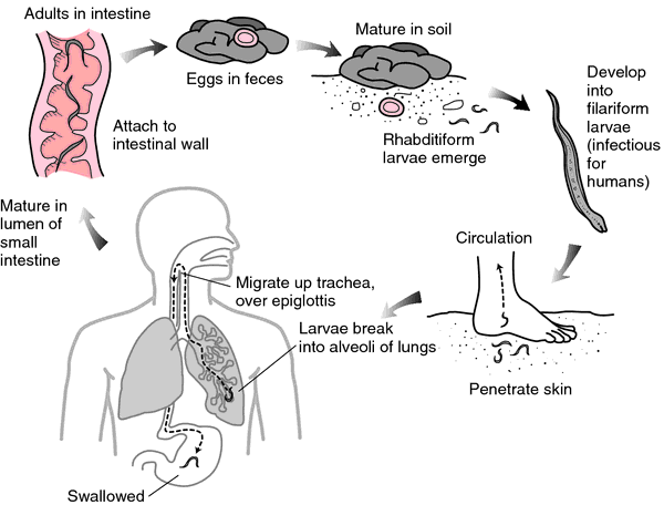 Soil Transmitted Helminths: Roundworms, Hookworms, and Whipworms Life Cycle is similar in all three groups and life cycles involve a single host. (1) Adults live in the intestine. (2) Eggs shed with feces and infect the soil. (3) Infection occurs as a result of ingestion of eggs (roundworms and whipworms) or infection via larval worms (hookworms). Hookworms is the second image. Whipworms was neglected in class